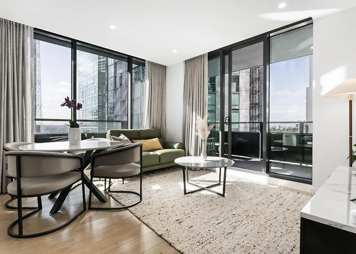 Das Sleek Southbank 2-Bed Apartment With Balcony Views Melbourne City liegt im Stadtteil Southbank in einer Entfernung von nur 9 Gehminuten von der Eureka Skydeck 88 Aussichtsplattform. Nur wenige Schritte entfernt von der NGV gelegen, bietet das Apartment eine Terrasse, wo Gäste einen Ausblick auf die Stadt genießen können.